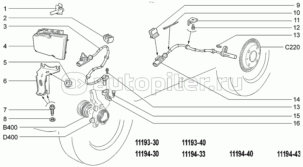 Гидроагрегат АБС и датчики скорости колес (15,16,115,116)