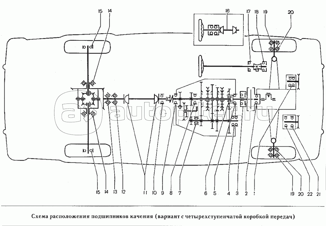 Схема расположения подшипников качения (вариант с четырехступенчатой коробкой передач)